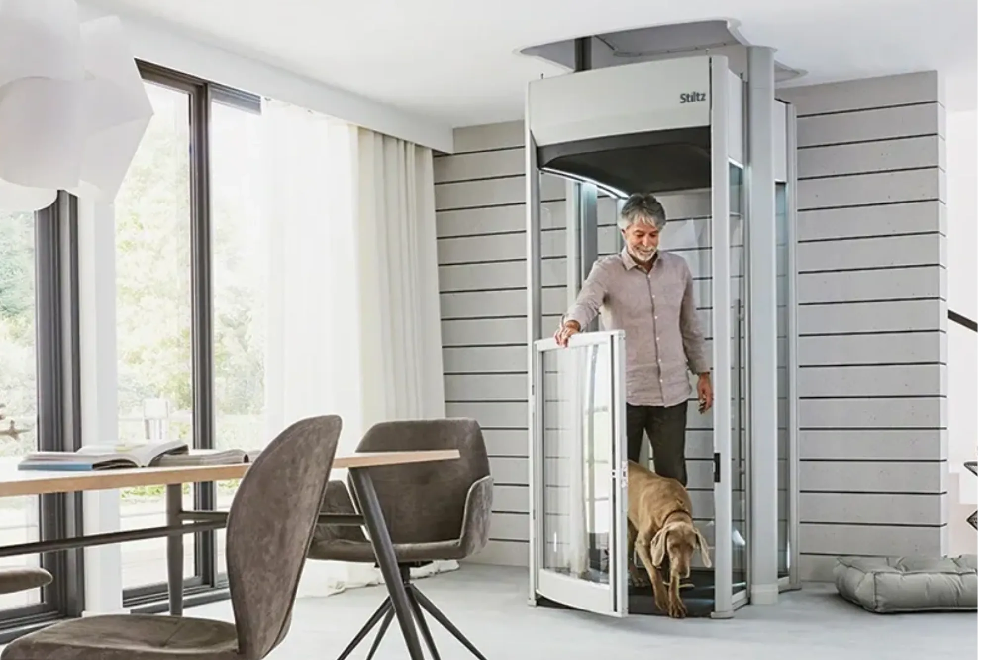 Stiltz Duo+ is a free-standing, self-supporting lift with no visible hoist and no noisy motor. It offers a small footprint, quiet travel, and fast installation, making it ideal for modern spaces.